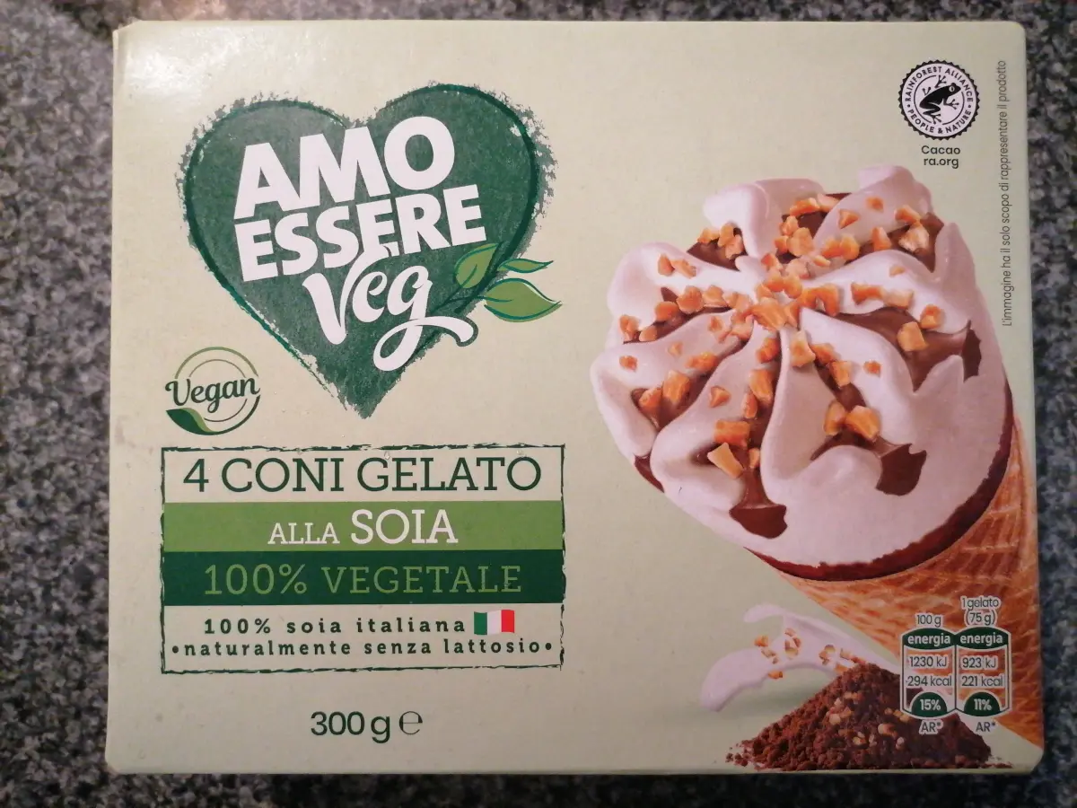 Soy ice cream, hazelnut pieces and cocoa topping.