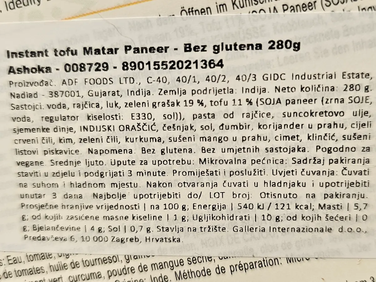 Voda, rajčica, luk, zeleni grašak 19 %, tofu 11 % (soja paneer - zrna soje, voda, regulator kiselosti: E330, sol), pasta od rajčice, suncokretovo ulje, sjemenke dinje, indijski oraščić, češnjak, sol, đumbir, korijander u prahu, cijeli crveni čili, kim, zeleni čili, kurkuma, sušeni mango u prahu, cimet, klinčić, sušeni listovi piskavice.