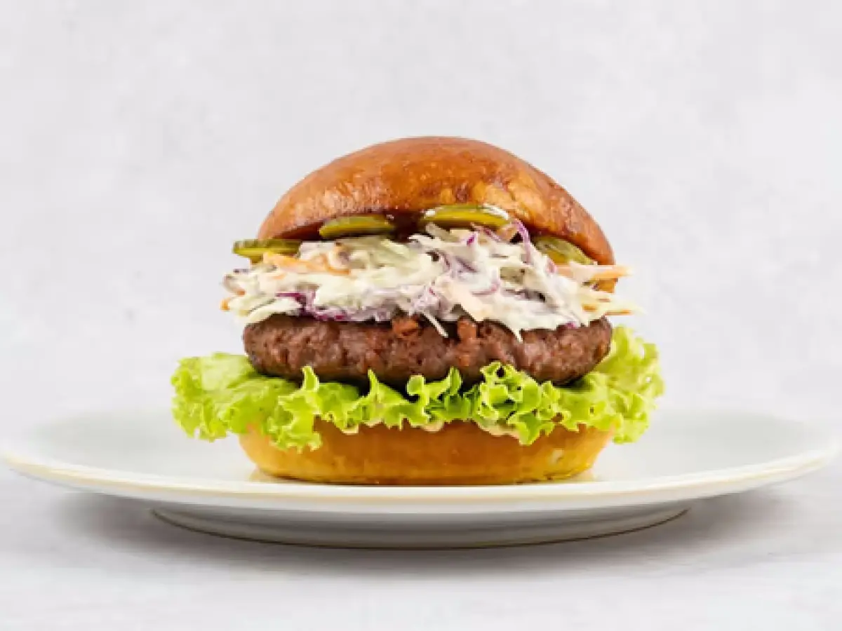 Domaće pecivo, beyond meat pljeskavica, coleslaw, salata, burger umak