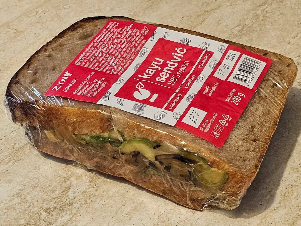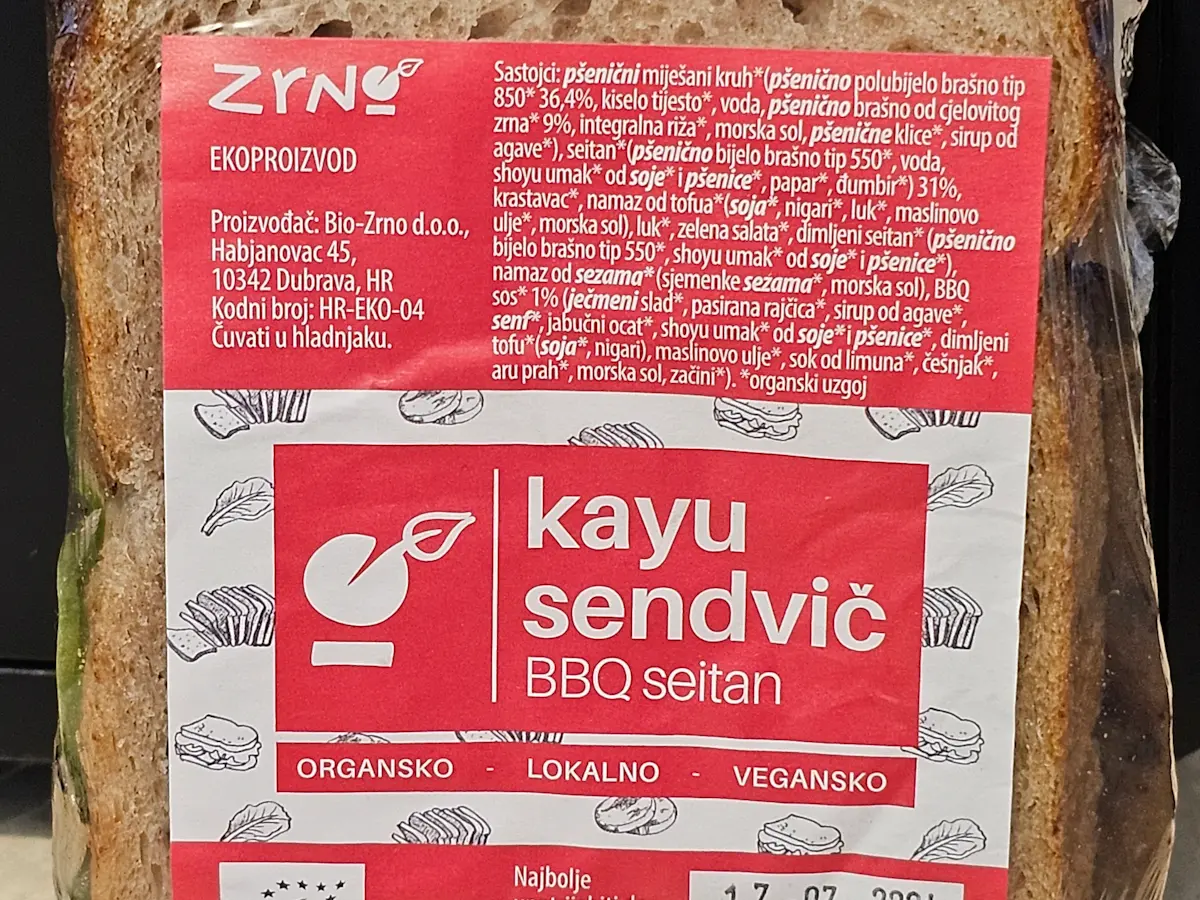 Pšenični miješani kruh, seitan 31 % (pšenično brašno T-550, soja sos, đumbir, papar), krastavac, namaz od tofua (soja, nigari, luk, maslinovo ulje), luk, salata, dimljeni seitan (pšenično brašno T-550, soja sos), maslac od sezama, bbq sos 1 %.