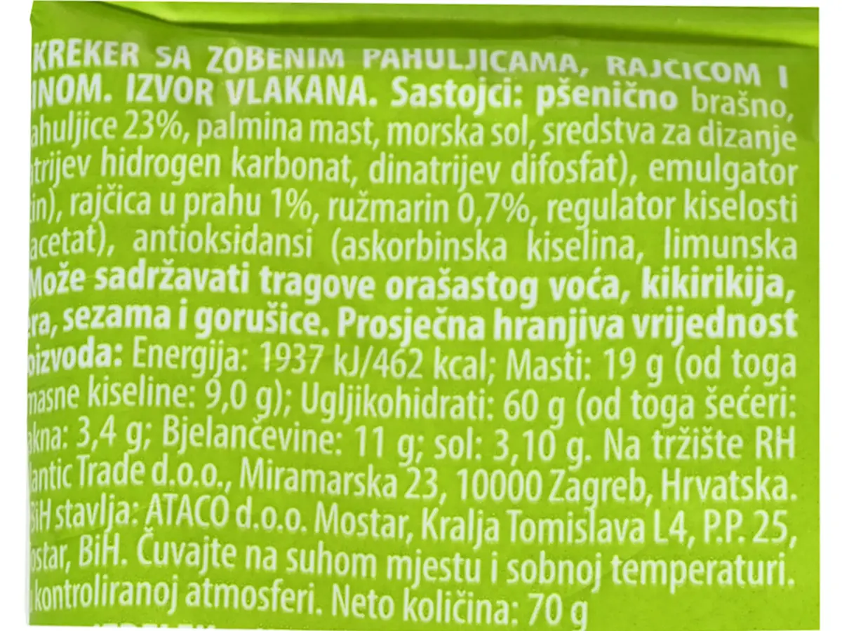 Pšenično brašno, pahuljice 23 %, palmina mast, morska sol, sredstva za dizanje tijesta: natrijev hidrogen karbonat, dinatrijev difosfat), emulgator (soja lecitin), rajčica u prahu 1 %, ružmarin 0,7 %, regulator kiselosti (natrijev acetat), antioksidansi (askorbinska kiselina, limunska kiselina).