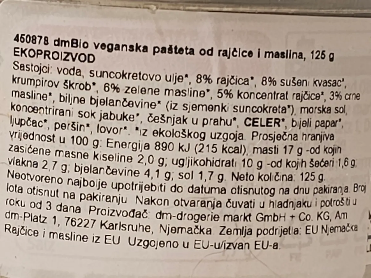 Namaz od rajčice i maslina iz organskog uzgoja na bazi kvasca sa 6 % maslinovog ulja.