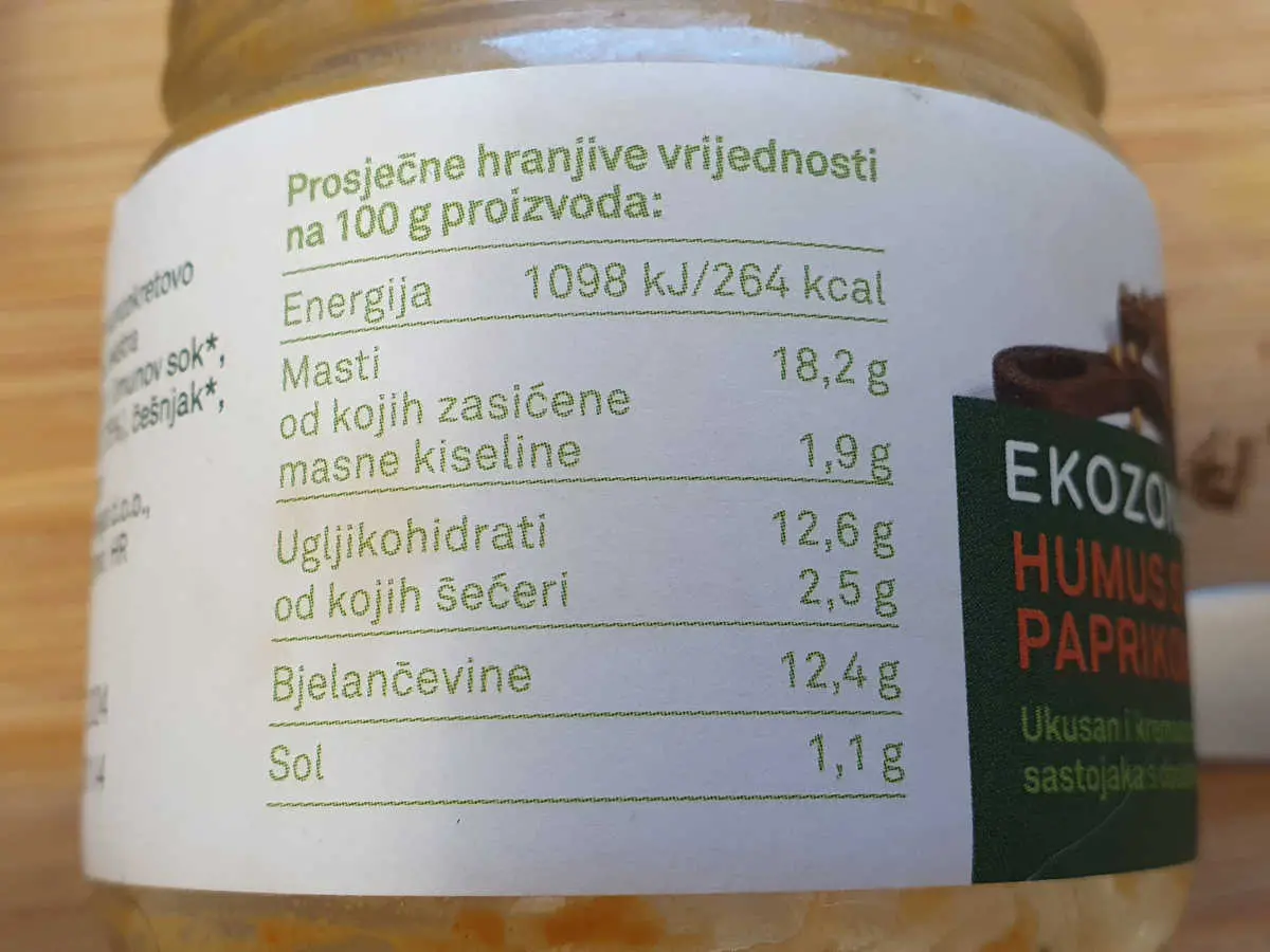 Voda, slanutak*, hladno prešano suncokretovo ulje*, tahini (sezam)* 9 % , ekstra djevičansko maslinovo ulje*, limunov sok*, crvena paprika u prahu* (3,75 %), češnjak*, sol, papar*.