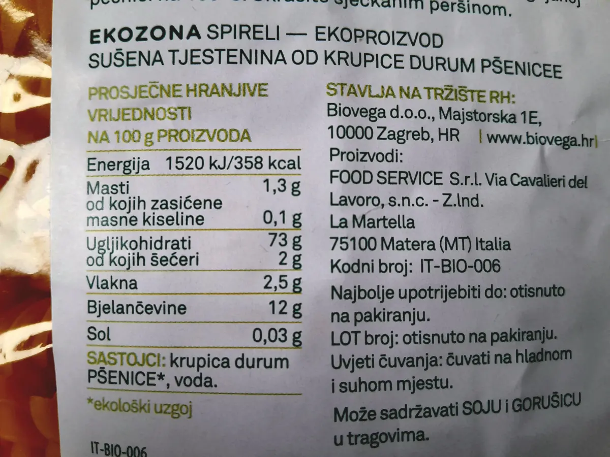 Energija: 1516 kJ / 358 kcalMasti: 1.5 g- od kojih zasićene masne kiseline: 0.3 gUgljikohidrati: 73.0 g- od kojih šećeri: 3.0 gBjelančevine: 11.5 gSol: 0.01 g