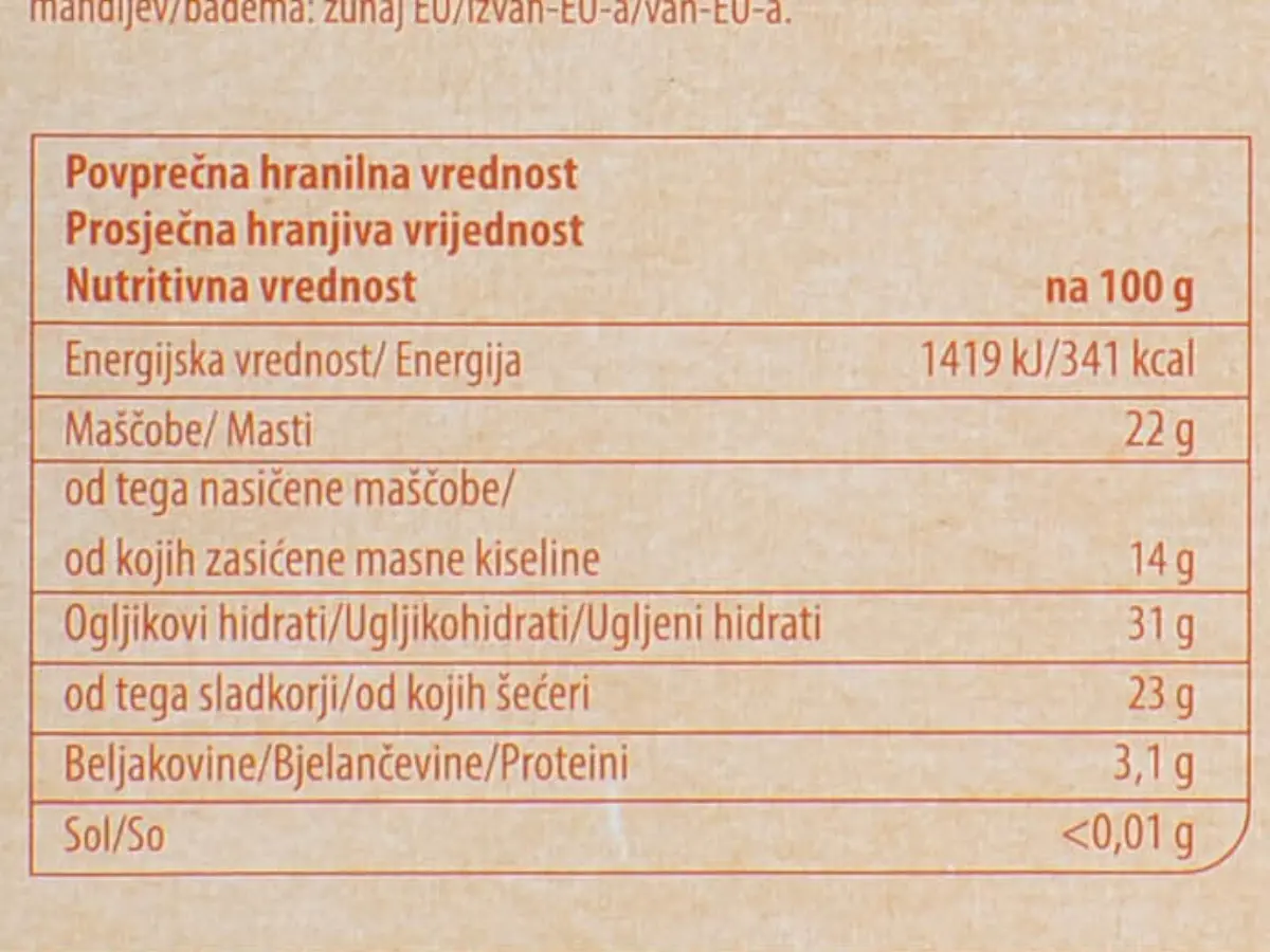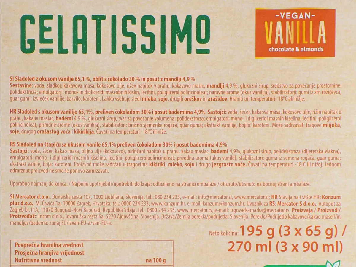 Sastojci: voda, šećer, kakaova masa, kokosovo ulje, rižin napitak u prahu, kakaov maslac, bademi 4,9 %, glukozni sirup, tvar za povećanje volumena:polidekstroza, emulgatori: mono-i digliceridi masnih kiselina, lecitini, poliglicerol poliricinoleat, prirodne arome (okus vanilija), stabilizatori: brašno sjemenke rogača, guar guma, ekstrakt vanilije, bojilo: karoteni.