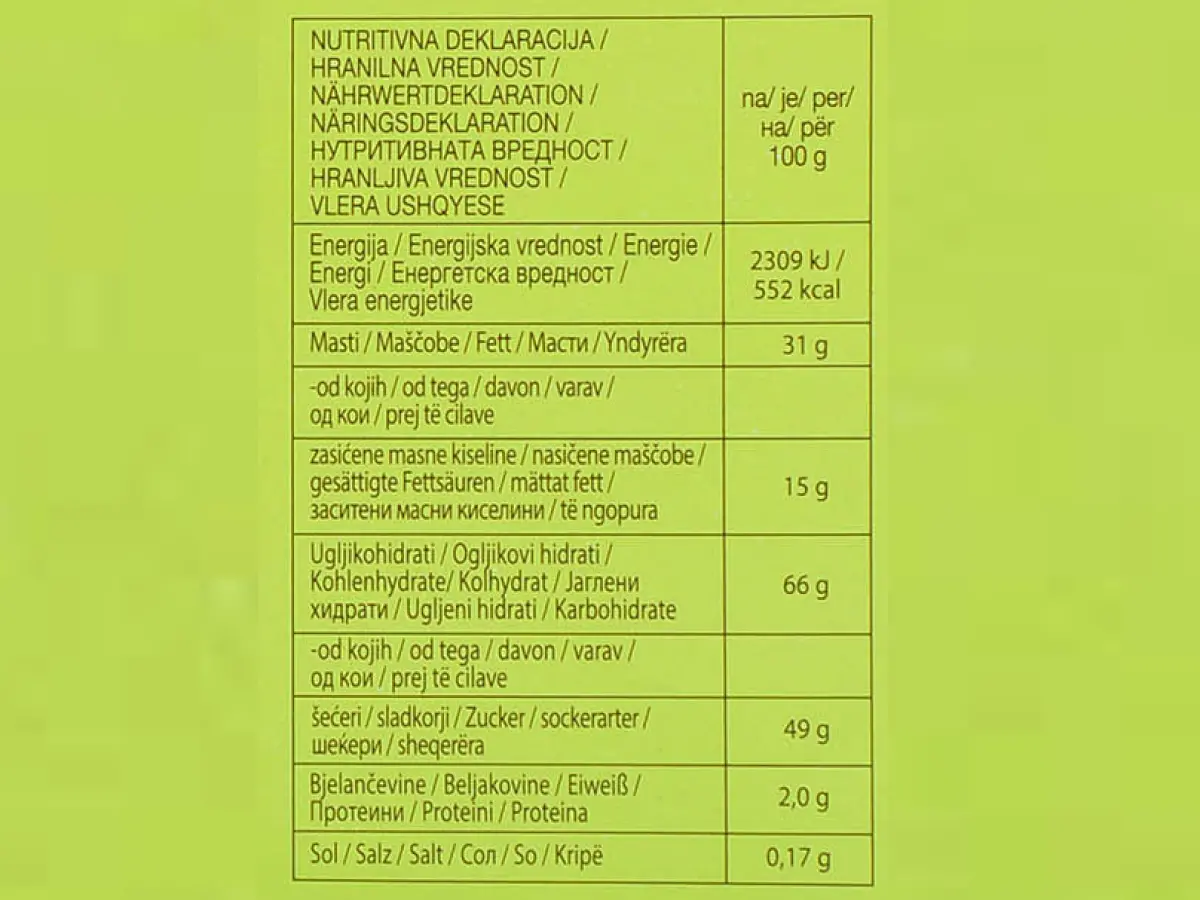 Proizvod sadrži gluten i soju, a može sadržavati lješnjak i mlijeko u tragovima.