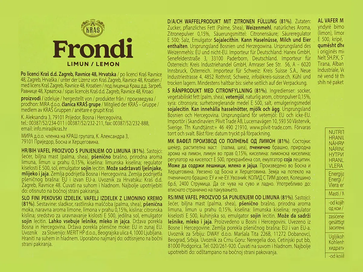 Šećer, biljna mast (palma, shea), pšenično brašno, prirodna aroma limuna, limun u prahu 0,15 %, kiselina: limunska kiselina; regulator kiselosti E500, sol, emulgator sojin lecitin.