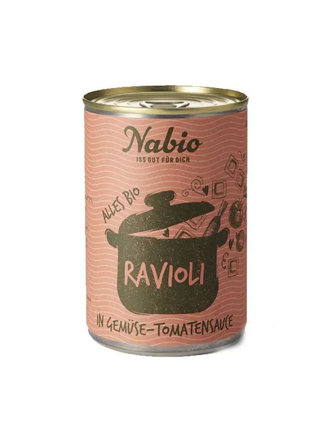 Sastojci: umak od rajčica i povrća* (85 %) (voda, pasta od rajčice* (22 %), rajčice* (8 %), mrkva* ( 6%), kukuruz* (2 %), grašak* (2 %), sirovi šećer šećerne trske*, zelena paprika* (2 %), morska sol, celer*, kukuruzni škrob*, začini*, bosiljak*, koncentrat soka limuna*), ravioli* (15 %) [tijesto* (tvrda pšenična krupica*, voda, kurkuma*), punjenje* (voda, mješavina povrća* (mrkva*, pastrnjak*, luk*, paprika*, rajčice*, špinat*), krumpirove pahuljice*, krušne mrvice* (pšenično brašno*, kvasac*), suncokretovo ulje*, povrtna juha* (morska sol, luk*, mrkva*, poriluk*, pastrnjak*, bilje*, začini*), papar*