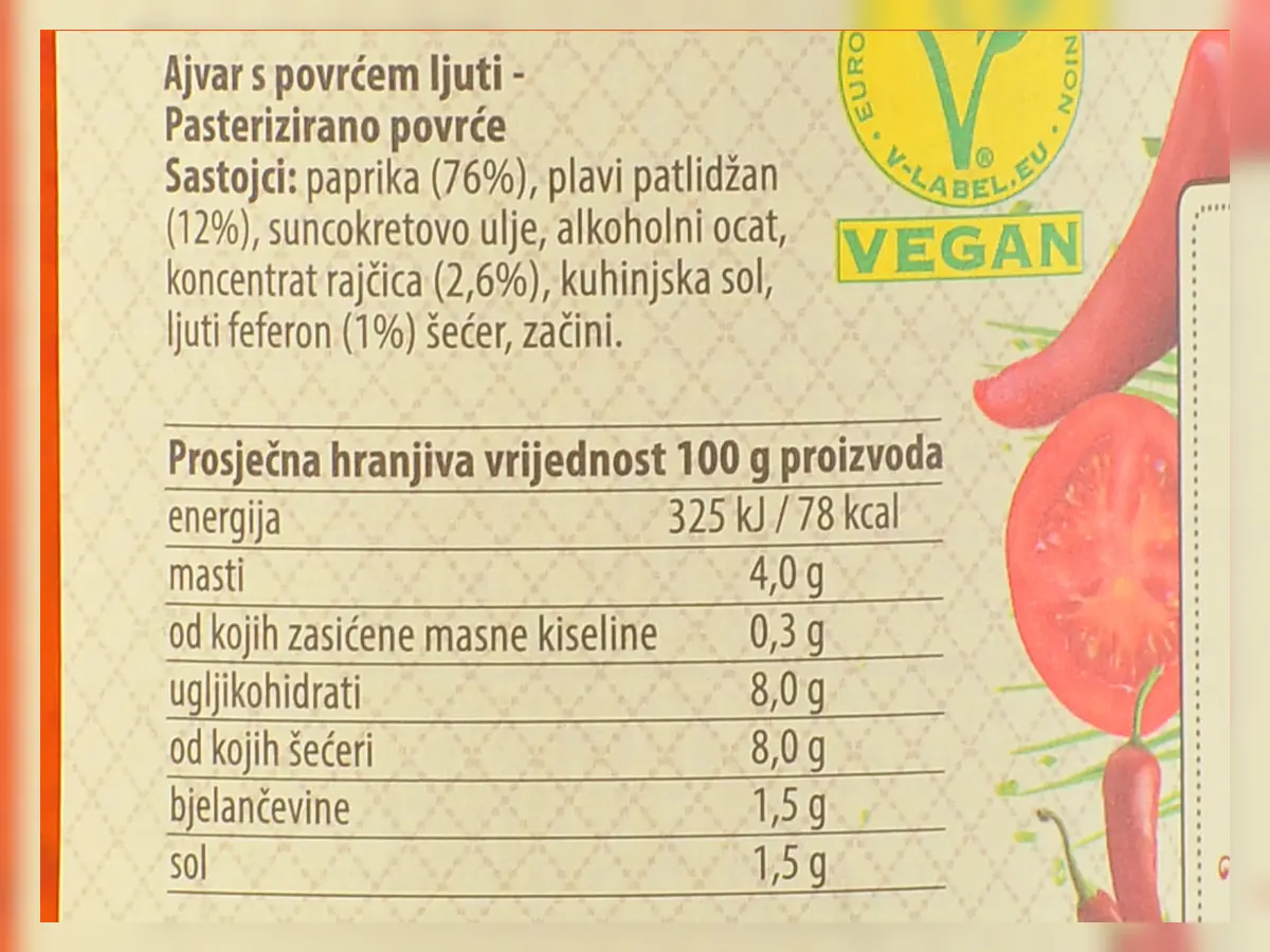Paprika (76 %), plavi patliđan (12 %), suncokretovo ulje, alkoholni ocat, koncentrat rajčica (2,6 %), kuhinjska sol, ljuti feferon (1 %), šećer, začini.