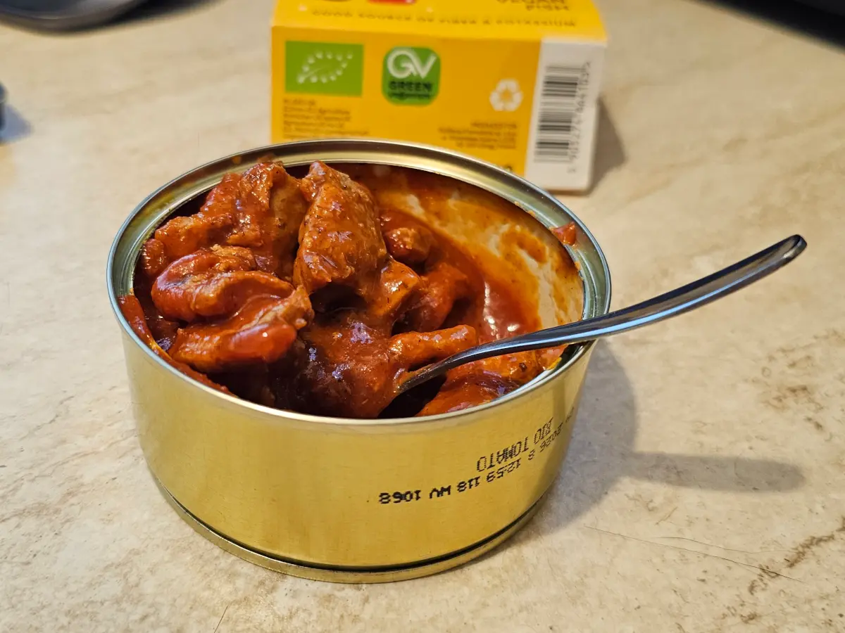 A plant-based alternative to traditional mackerel in tomatoes, based on a recipe from an old Polish fish processor.