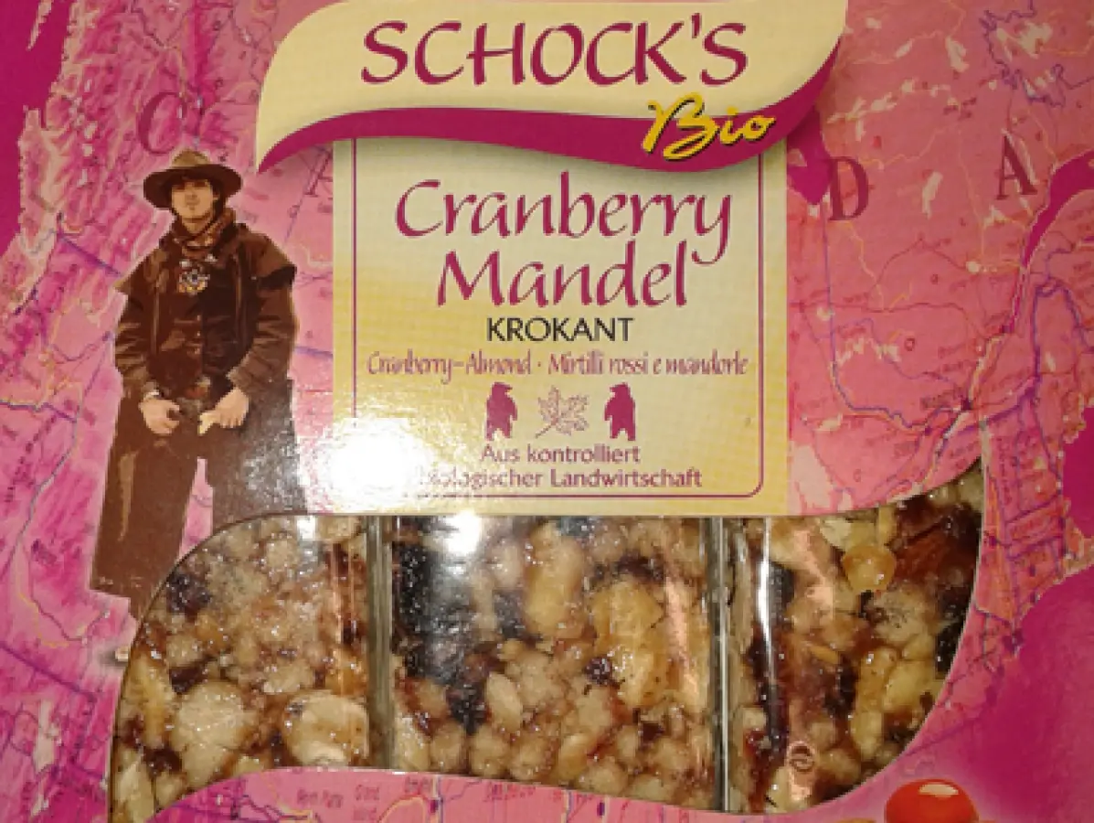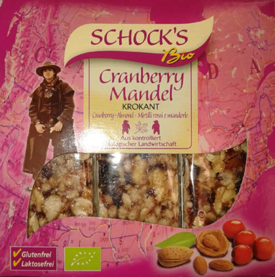 kikiriki 21 %, badem 19 %, maltozni sirup, rižine pahuljice (sol 1 %, rižino brašno, kukuruzno brašno), ušećerene brusnice 14 % (brusnice, šećer, suncokretovo ulje), šećer, grožđice