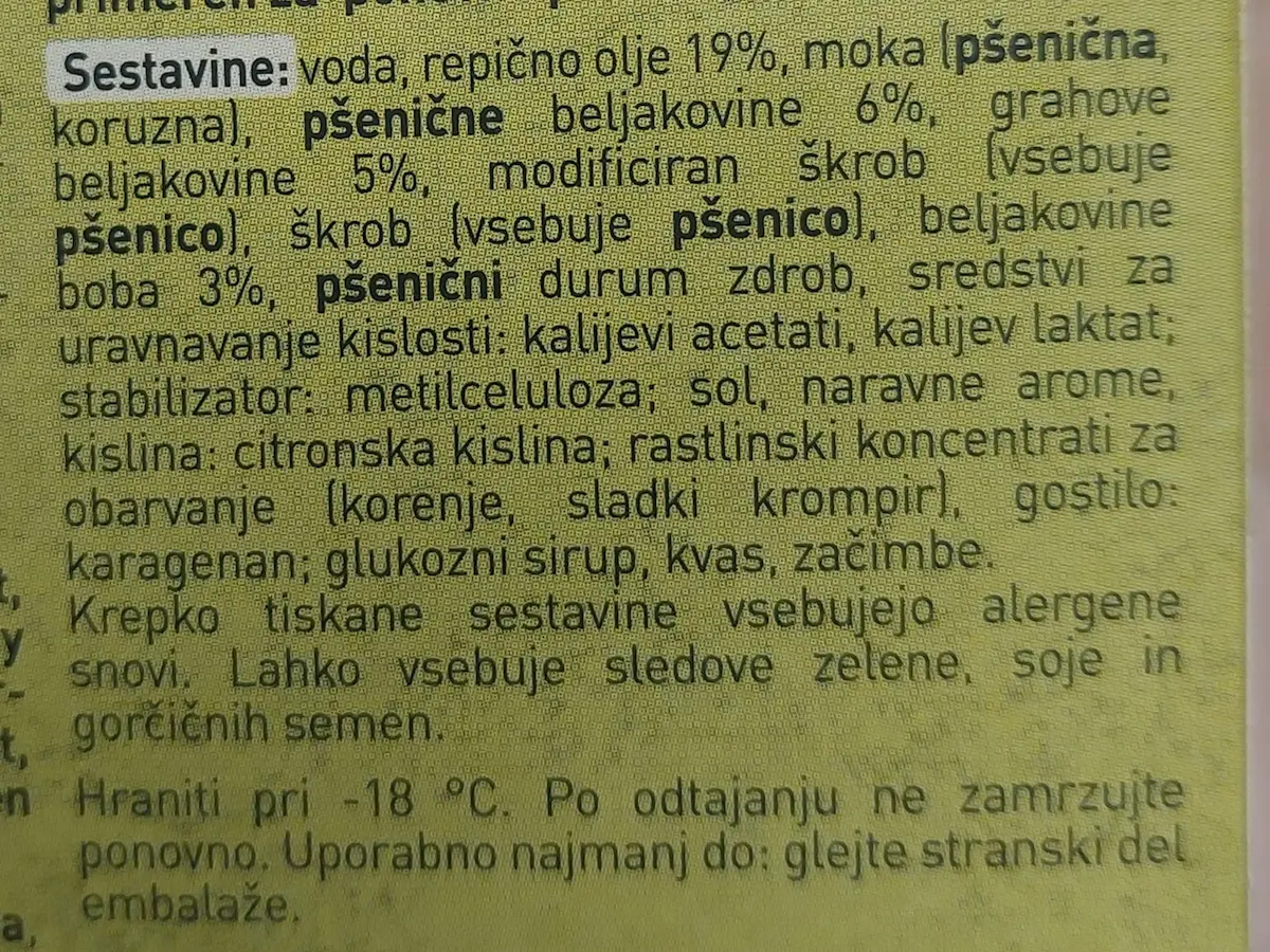 Voda, repičino ulje 19 %, brašno (pšenično, kukuruzno), protein pšenice 6 %, protein graška 5 %, modificirani škrob (sadrži pšenicu), škrob (sadrži pšenicu), protein boba 3 %, semenol tvrde pšenice, regulatori kiselosti: kalijev acetati, kalijev laktat; stabilizator: metilceluloza, nejodirana sol, prirodne arome, zakiseljivač: limunska kiselina, biljni koncentrati za bojenje (mrkva, slatki krumpir), zgušnjivač: karagenan, glukozni sirup, kvasac, začini.