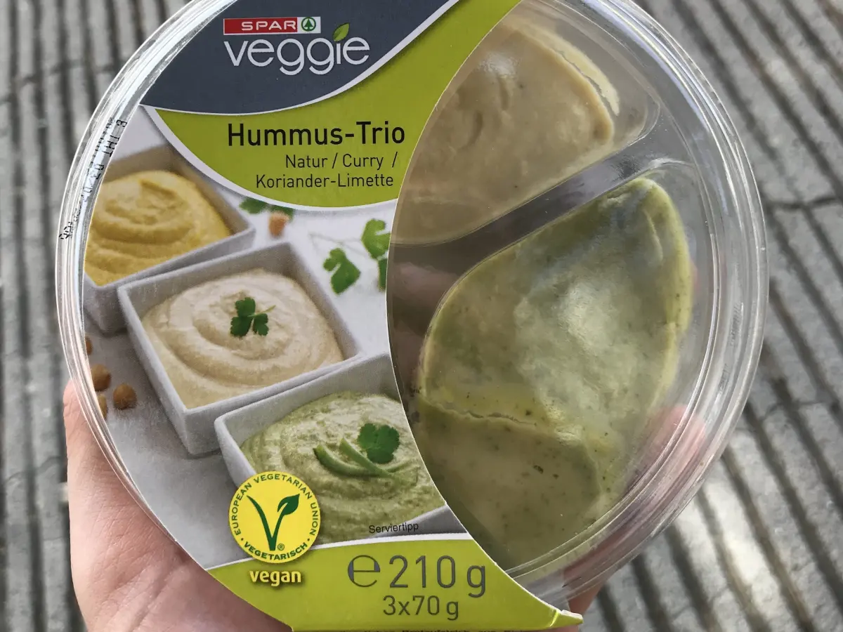 Slanutak 37 %, voda, maslinovo ulje, pasta od sezama (sezam, ulje sezama), sol, regulator kiselosti: limunska kiselina, češnjak, konzervans sorbinska kiselina, benzojeva kiselina, papar; namaz na bazi slanutka i currya: slanutak 33 %, maslinovo ulje, pasta od sezama (sezam, ulje sezama), voda, šećer, sol, regulator kiselosti: limunska kiselina, češnjak, ekstrakt mrkve, papar, ocat, curry 0.2 %, zgušnjivač guar guma, konzervans sobinska kiseilna, benzojeva kiselina; namaz na bazi slanutka s korijanderom i limetom: slanutak, 35 %, mslinovo ulje, pasta od sezama (sezam, ulje sezama), voda, limeta 5 %, korijandar 4 %, sol, regulator kiselosti: limunska kiselina, češnjak, konzervans sorbinska kiselist, benzojeva kiselina, papar