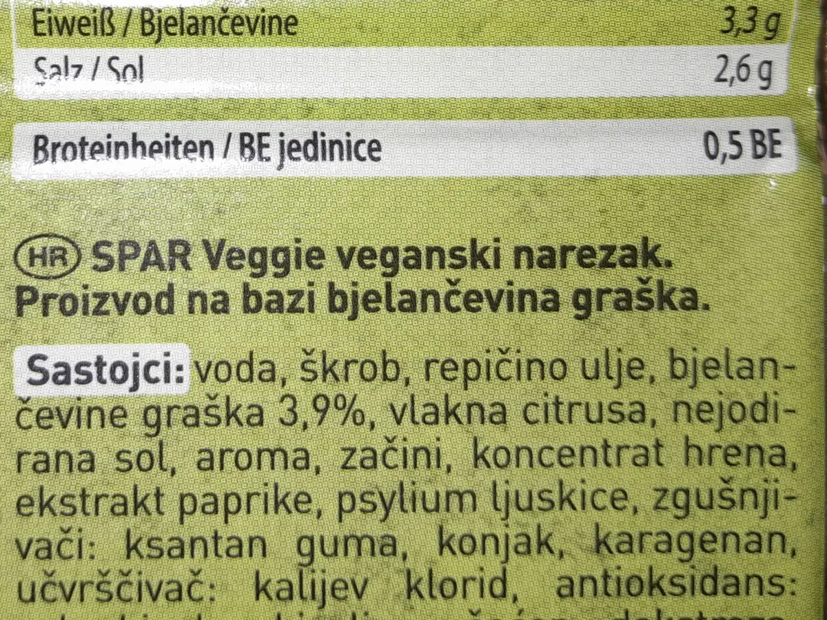 Voda, škrob, repičino ulje, bjelančevine graška 3,9 %, vlakna citrusa, nejodirana sol, aroma, začini, koncentrat hrena, ekstrakt paprike, psylium ljuskice, zgušnjivači: ksantan guma, konjak, karagenan, učvrščivač: kalijev klorid, antioksidans: askorbinska kiselina, šećer, dekstroza, aroma dima, konzervans: kalijev sorbat.