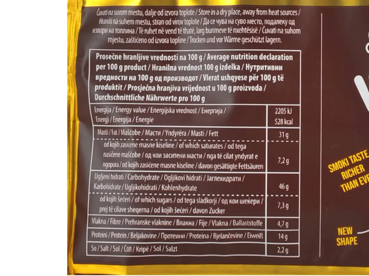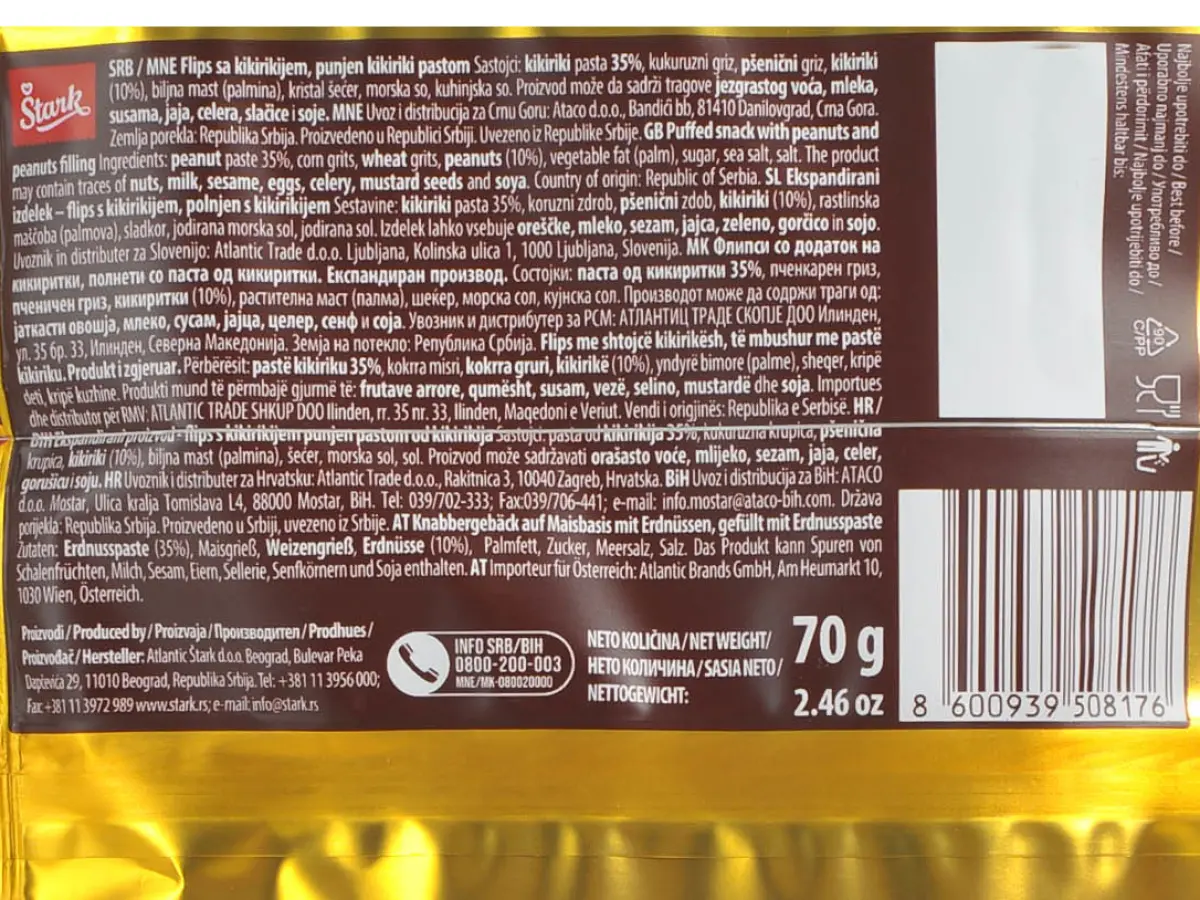 Kikiriki pasta 35 %, kukuruzni griz, pšenični griz, kikiriki 10 %, palmina mast, kristal šećer, morska sol, kuhinjska sol.