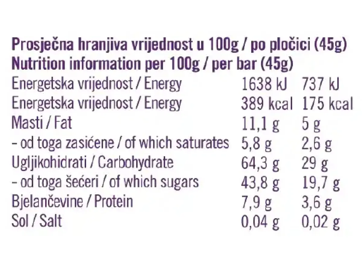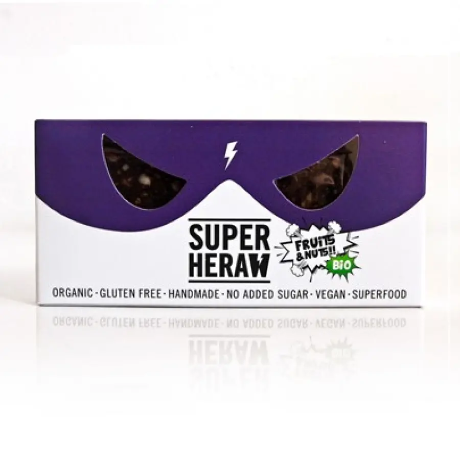 Datulje, šljive, grožđice, indijski oraščići, bademi, brazilski oraščići, sjeme suncokerta, sjeme bundeve, kakao u prahu, kokos. Iz kontroliranog eko uzgoja