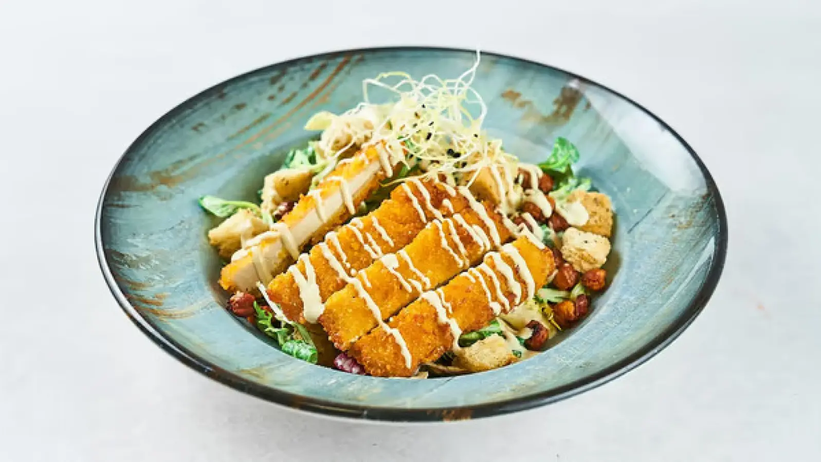 Iceberg salata, radič, domaći Caesar umak, pečeni slanutak, tofu katsu, sušena rajčica, krutoni kruha (350 g)