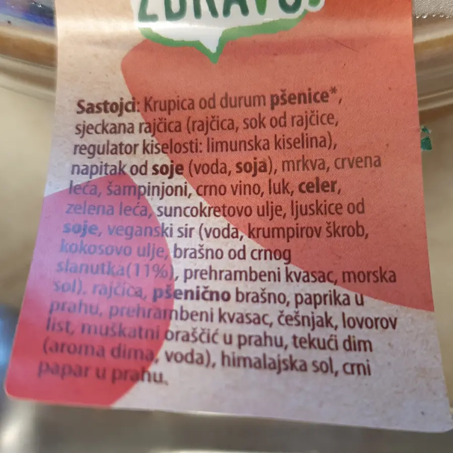 Krupica od durum pšenice, sjeckana rajčica (rajčica, sok od rajčice, regulator kiselosti: limunska kiselina), napitak od soje (voda, soja), mrkva, crvena leća, šampinjoni, crno vino, luk, celer, zelena leća, suncokretovo ulje, ljuskice od soje, veganski sir (voda, krumpirov škrob, kokosovo ulje, brašno od crnog slanutka - 11 %, prehrambeni kvasac, morska sol), rajčica, pšenično brašno, paprika u prahu, prehrambeni kvasac, češnjak, lovorov list, muškatni oraščić u prahu, tekući dim (aroma dima, voda), himalajska sol, crni papar u prahu.