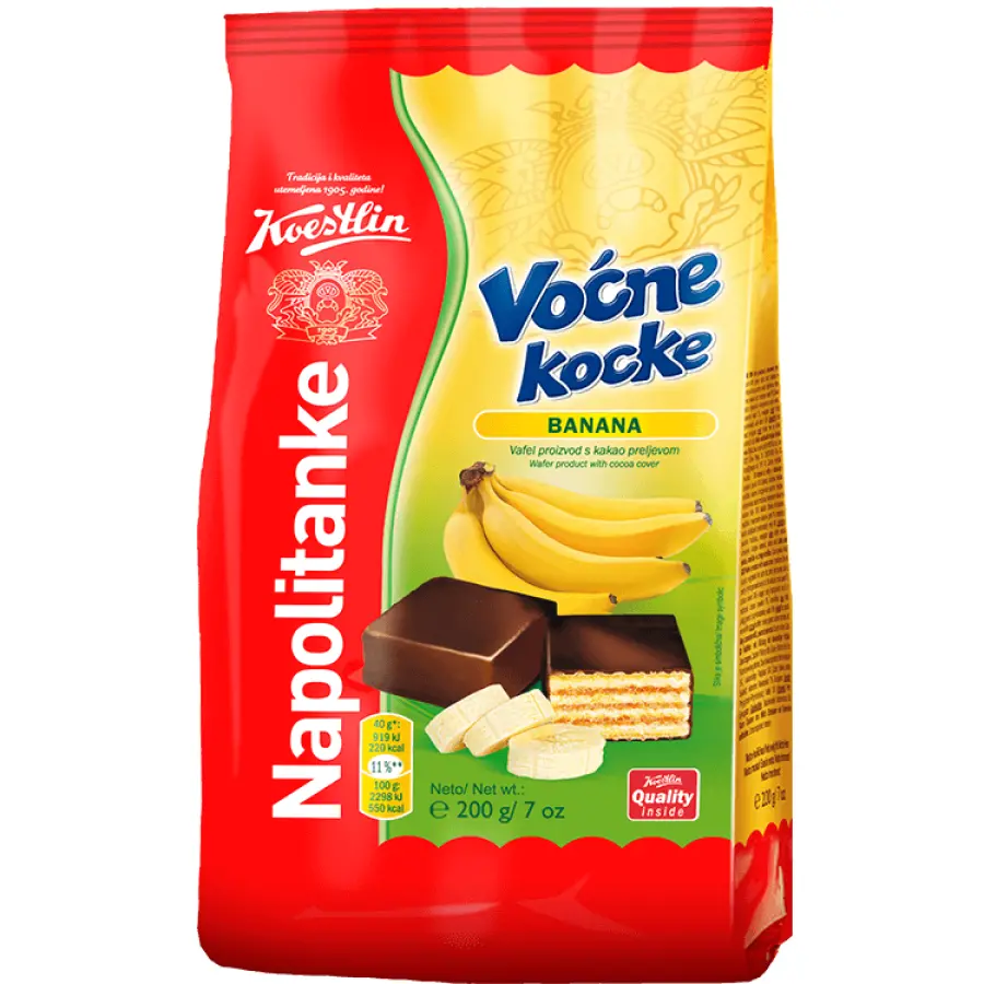 punilo 48 % (šećer, biljna mast: palmina mast, djelomično hidrogenirana palmina mast, djelomično hidrogenirana sojina mast; škrob, banana u prahu 0,1 %, aroma, kiselina: limunska kiselina, bojilo: Beta-apo-8’-carotenal (C30)), kakaov preljev 32 % (šećer, djelomično hidrogenirana sojina mast, kakaov prah smanjene masti 7 %, emulgatori: sojin lecitin, poliglicerol poliricinoleat), vafel listovi 20 % (pšenično brašno, palmina mast, emulgator sojin lecitin, tvar za rahljenje: natrijevi karbonati, sol)