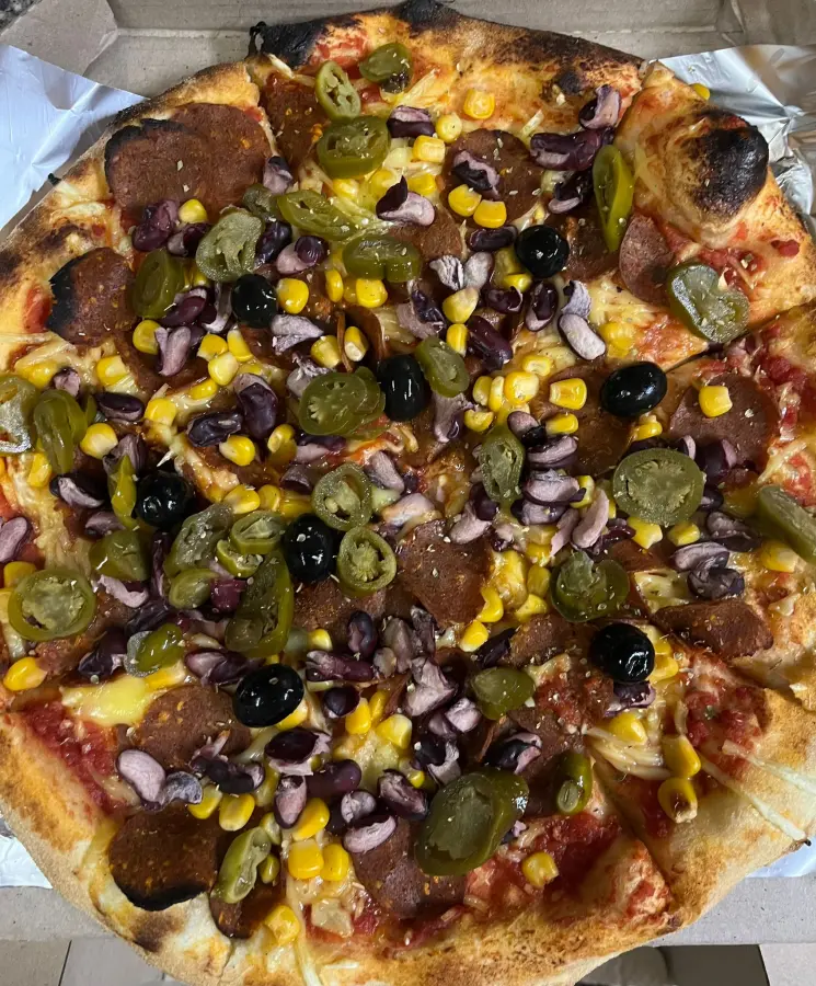Polpa, Violife veganski sir, Primavita veganska mozzarella, Stellina kobasica, grah, kukuruz, jalapeño papričice, masline i origano.