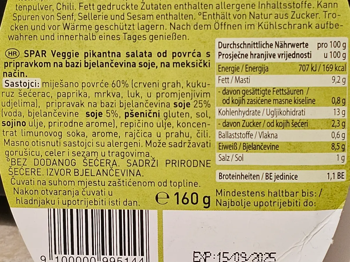 Miješano povrće 60 % (crveni grah, kukuruz šećerac, paprika, mrkva, luk, u promjenjivim udjelima), pripravak na bazi bjelančevina soje 25 % (voda, bjelančevine soje 5 %, pšenični gluten, sol, sojino ulje, prirodne arome), repičino ulje, koncentrat limunovog soka, arome, rajčica u prahu, čili.